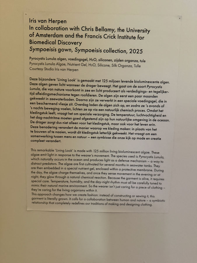 Below: The Algae dress was in a glass box with a mist to keep the 125 million living bioluminescent algae alive. Yes, you read that correctly. More explanation underneath the photo in Dutch and in English.
