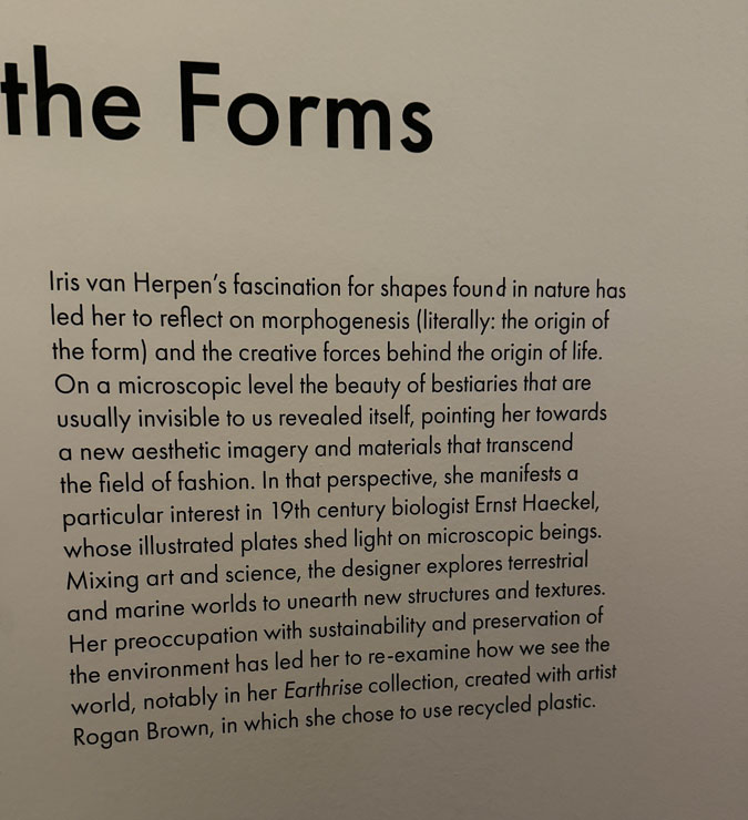Below: Morphogenesis dress, again with the explanation underneath it. Iris van Herpen uses materials and techniques which are light years ahead of the rest of the industry. You might think ‘That is unwearable’, but A) it isn’t although perhaps more for performing artists and B) she is as much an artist as a dress maker.